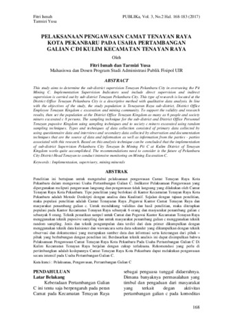 This study aims to determine the sub-district supervision Tenayan Pekanbaru City in overseeing the Pit Mining C. Implementation Supervision Indicators used include direct supervision and indirect supervision is carried out by sub-district Tenayan Pekanbaru City. This type of research is located at the District Office Tenayan Pekanbaru City is a descriptive method with qualitative data analysis. In line with the objectives of the study, the study population is Tenayaran Raya sub-district, District Office Employee Tenayan Kingdom c excavation and mining community. To support the validity and research results, then set the population at the District Office Tenayan Kingdom as many as 6 people and society miners excavated c 8 persons. The sampling technique for the sub-district and District Office Personnel Tenayan puposive Kingdom using sampling techniques and to society c miners excavated using random sampling techniques. Types and techniques of data collection consisted of primary data collected by using questionnaire data and interviews and secondary data collected by observation and documentation techniques that are the source of data and information as well as information from the parties - parties associated with this research. Based on this analysis technique can be concluded that the implementation of sub-district Supervision Pekanbaru City Tenayan In Mining Pit C at Kulim District of Tenayan Kingdom works quite accomplished. The recommendations need to consider is the future of Pekanbaru City District Head Tenayan to conduct intensive monitoring on Mining Excavation C.