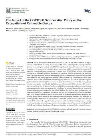 Amirudin, Amirudin and Urbanski, Mariusz and Saputra, Jumadil and Johansyah, Muhamad Deni and Latip, Latip and Yusa, Ahmad Tarmizi and Afrizal, Teuku (2021) The Impact of the COVID-19 Self-Isolation Policy on the Occupations of Vulnerable Groups. International Journal of Environmental Research and Public Health, 18 (12). ISSN 1790-5079