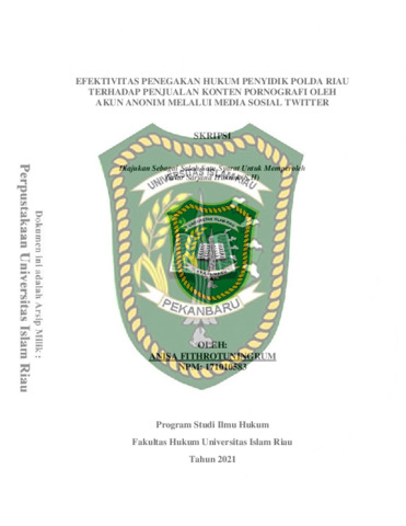 Fithrotuningrum, Anisa (2021) EFEKTIVITAS PENEGAKAN HUKUM PENYIDIK POLDA RIAU TERHADAP PENJUALAN KONTEN PORNOGRAFI OLEH AKUN ANONIM MELALUI MEDIA SOSIAL TWITTER. Other thesis, Universitas Islam Riau.