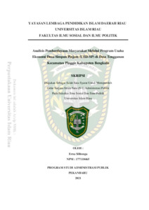 Analysis Of Community Empowerment Through The Savings And Loan Village Economic Business Program (UED-SP) In Tengganau Village, Pinggir District, Bengkalis Regency By Erna Silitonga 177110465 ABSTRACT This study aims to identify and analyze community empowerment through the Savings and Loans Village Economic Business Program (UED-SP) in Tengganau Village, Pinggir District, Bengkalis Regency. The indicators used include awareness and behavior formation, ability transformation, and level of ability. This type of research is a quantitative descriptive survey, while the data collection techniques used are primary data collected by using questionnaires, interviews. and secondary data collected using the observation documentation technique. Based on this analysis technique, the researcher can conclude that Community Empowerment through the Savings and Loans Village Economic Business Program (UED-SP) in Tengganau Village, Pinggir District, Bengkalis Regency is categorized as Good Enough. The inhibiting factors are the lack of firmness and sanctions for handling arrears, and the lack of guidance, assistance and supervision from the sub-district. Therefore, the UED-SP program has not empowered the people of Tengganau Village.