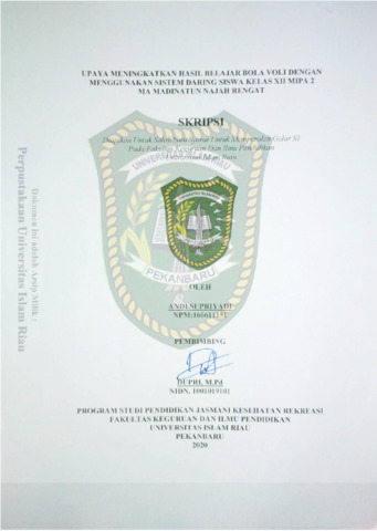 Supriyadi, Andi (2020) Upaya Meningkatkan Hasil Belajar Bola Voli Dengan Menggunakan Sistem Daring Siswa Kelas XII MIPA 2 MA Madinatun Najah Rengat. Other thesis, Universitas Islam Riau.