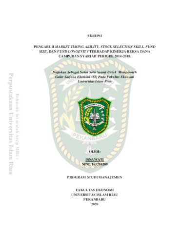 Isnawati, Isnawati (2020) Pengaruh Market Timing Ability, Stock Selection Skill, Fund Size dan fund Longevity terhadap Kinerja Reksadana Campuran Syariah Periode 2014–2018. Other thesis, Universitas Islam Riau.