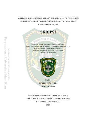 Putri, Juwita Fani (2020) Motivasi Belajar Siswa Kelas VIII 1 Dalam Mata Pelajaran Seni Budaya (Seni Tari) Di SMPN 4 Kecamatan Siak Hulu Kabupaten Kampar. Other thesis, Universitas Islam Riau.