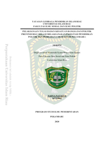 Natasya, Nadya (2020) Pelaksanaan Tugas Badan Kesatuan Bangsa dan Politik Provinsi Riau Dalam Melaksanakan Fasilitasi Pemdidikan Politik dan Pemilihan Umum (Studi Pekanbaru). Other thesis, Universitas Islam Riau.