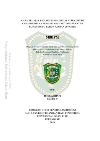 How To Learn Biology Class XI Students IPA (Case Study at SMAN 1 Control IV Koto, Rokan Hulu Regency Academic Year 2019/2020) TITIK AFRIANI NPM. 166510547 Thesis of Biology Education Study Program. Faculty of Teacher Training and Science Education Riau Islamic University Main Advisor: Sepita Ferazona, M.Pd ABSTRACT This research aims to find out how to study biology of students of class XI IPA in SMAN 1 in Control IV Koto, Rokan Hulu Regency. This research uses a qualitative method with a case study approach. The instrument used in this study uses interview sheets as main data, observation sheets and documentation as supporting data. The sample used as many as 5 students, where the first student is a student who has a medium intelligence ability, the second student is a student who has a high intelligence ability, the third student has a low intelligence ability, while the fourth student is a student has a high intelligence ability, and students are the fifth students who have moderate intelligence. Then the data were analyzed using descriptive analysis. From the recapitulation of all indicators of learning methods for class XI Natural Sciences, 60,71% results are included in the competent category. Research results indicate that there needs to be some improvement in student learning, such as motivation or attention from parents and teachers, especially increasing student concentration in learning at home or at school.