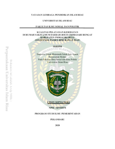 Septianora, Cindy (2020) Kualitas Pelayanan Kesehatan Di Rumah Sakit Umum Daerah (RSUD) Indrasari Rengat Kabupaten Indragiri Hulu (Studi Pada Pasien Bpjs Rawat Inap). Other thesis, Universitas Islam Riau.