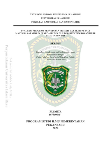 Rusmita, Rusmita (2020) Evaluasi Program Penyediaan Rumah Layak Huni Bagi Masyarakat Miskin Dikecamatan Pujud Kabupaten Rokan Hilir Pada Tahun 2018. Other thesis, Universitas Islam Riau.