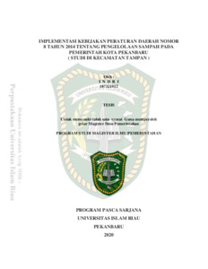 INDRI This study aims to determine the implementation of Local Regulation Policy No. 8 of 2014 concerning Waste Management in Pekanbaru City Government, especially in Tampan District and to determine the factors that hinder the implementation of Local Regulation Policy No. 8 of 2014 concerning Waste Management in Pekanbaru City Government, especially in Tampan District. The research problem limitation only covers the implementation of 6 (six) programs in Local Regulation No. 8 of 2014 concerning Waste Management, i.e. program : waste management education, community empowerment and social assistance, information dissemination, control and prevention of environmental pollution due to waste, law enforcement and application of technology in waste management. Research indicators consist of communication, resources, disposition and bureaucratic structure. This study employs qualitative approach with descriptive design. Informants involved in this research include the Head of the Environment and Sanitation Service, Head of the Environmental Law Enforcement Section, Head of the Reduction and Utilization of Waste Section, Head of the Division of Environmental Information and Communication Capacity Building, Head of Tampan District, Head of Sidomulyo Barat Village, Head of Tobek Godang Village, Head of Sialang Munggu Village, Director of Parent Garbage Bank of Bukit Hijau Berlian, Director of Green Waste Bank in Tobek Godang Village, Director of Karya Indah Waste Bank in Sialang Munggu Village, Director of Rukun Berlian Waste Bank in Sidomulyo Barat Village. The data collection was carried out through interview, observation and documentation. The data were analyzed by describing the theory obtained in the field objectively using data triangulation technique. Then, the conclusion is drawn. Based on this analysis technique, the author concludes that the implementation of Local Regulation Policy No. 8 of 2014 concerning Waste Management in Pekanbaru City Government (a study in Tampan District) has been done even though it is not optimal.