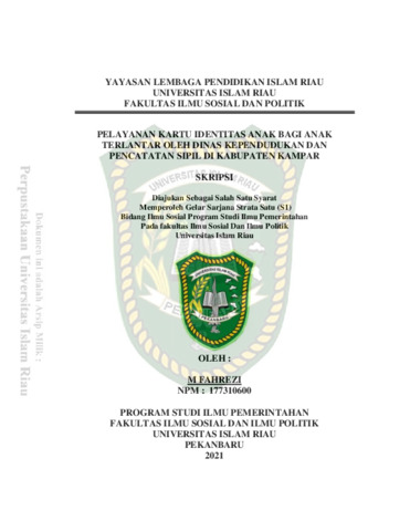 Fahrezi, M (2021) Pelayanan Kartu Identitas Anak Bagi Anak Terlantar Oleh Dinas Kependudukan Dan Pencatatan Sipil Di Kabupaten Kampar. Other thesis, Universitas Islam Riau.