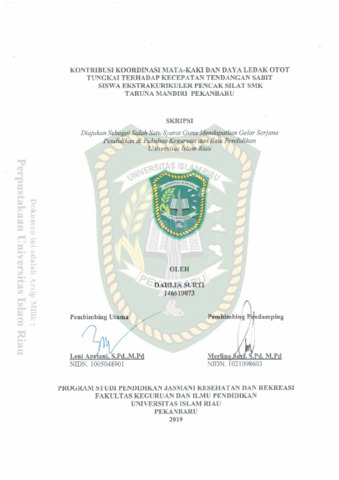 Surti, Dahlia (2020) Kontribusi Koordinasi Mata-kaki dan Daya Ledak Otot Tungkai Terhadap Kecepatan Tendangan Sabit Siswa Ekstrakurikuler Pencak Silat SMK Taruna Mandiri Pekanbaru. Other thesis, Universitas Islam Riau.