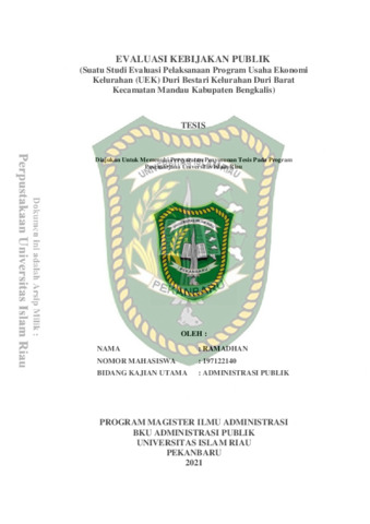 Ramadhan, Ramadhan (2022) Evaluasi Kebijakan Publik (Suatu Studi Evaluasi Pelaksanaan Program Usaha Ekonomi Kelurahan (UEK) Duri Bestari Kelurahan Duri Barat Kecamatan Mandau Kabupaten Bengkalis). Masters thesis, Universitas Islam Riau.
