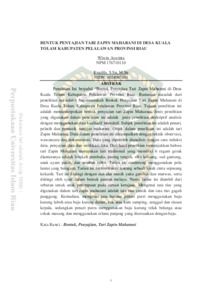 This understanding is entitled the form of presentation of the Zapin Maharani dance in the village of Kuala Tolam Pelalawan regency Riau province. The formulation of the problem from this research is how is the form of presentation of the Maharani Zapin dance in the village of Kuala Tolam Pelalawan regency Riau Province. The purpose of this study is to describe the form of presentation of the Zapin Maharani dance. The type of research used in this study is a descriptive analysis type using interactive qualitative data. The subject of this research are the dancer, trainers and musicians of the Maharani studio. The object of this research is the Zapin Maharani dance. The data in this study were collected by interview, observasion and documentation. The data obtained were analyzed by means of data reduction, data presentation and data verication. The results of the study indicate that the Zapin Maharani dance is a traditional dance that has 6 types of movements including the opening step, dizziness, middle elbow, keluang, hanging broken chicks and worship the throne. This dance tends to use a veriety of floor patterns. This dance tells about a love atory between lovers. Is accompanied by two musical instruments, gambus and marwas. And accompanied by woman in the form of Malay rhymes, but this dance is taken from the title for girls in the royal era. Regarding the make up used in the Zapin Maharani dance, it is beautiful make up and stage dashing make up, then about the female dancer clothing using the brackets laboh clothes, a skirt or cloth besaide a bun and headdress, whilw male dancer wear baju kurung teluk belanga and wearing trousers that match the clothes.