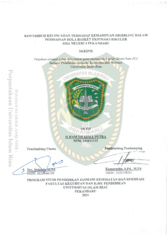 Putra, Ilham Dharma (2021) Kontribusi Kelincahan Terhadap Kemampuan Dribbling Dalam Permainan Bola Basket Ekstrakurikuler SMA Negeri 4 Pekanbaru. Other thesis, Universitas Islam Riau.
