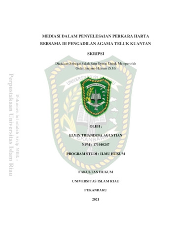 Agustian, Elvin Triandesa (2021) Mediasi Dalam Penyelesaian Perkara Harta Bersama Di Pengadilan Agama Teluk Kuantan. Other thesis, Universitas Islam Riau.