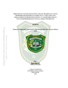 Wahyuni, Putri (2021) Perlindungan Hukum Bagi Penyandang Disabilitas Untuk Memperoleh Kesempatan Kerja Di CV. Surya Pelangi Sebagai Bentuk Pemenuhan Kuota 1% Oleh Perusahaan Dalam Mempekerjakan Tenaga Kerja Disabilitas. Other thesis, Universitas Islam Riau.