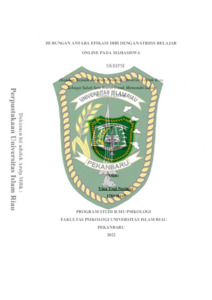 THE RELATIONSHIP BETWEEN SELF-EFFICIENCY AND STRESS IN STUDENTS' ONLINE LEARNING Vina Yogi Noviana 178110168 FAKULTAS PSIKOLOGI UNIVERSITAS ISLAM RIAU Students who are not able to adapt to online learning will experience stress. The stress of online learning is a pressure of learning activities and cannot be faced by mental, physical, emotional students. This study aims to determine the relationship between self-efficacy and learning stress in students. The data collection method used a self-efficacy scale with a total of 37 items and a learning stress scale with a total of 37 items. The sample in the study amounted to 201 Psychology students. The sampling technique used in this research is proportional random sampling. The data analysis method used is Spearmean's Rank Order. The results of statistical analysis showed a correlation coefficient of 0.299 with a significant value of 0.000 (p <0.05). This shows that there is a significant negative correlation between self-efficacy and learning stress in Psychology students at the Islamic University of Riau.
