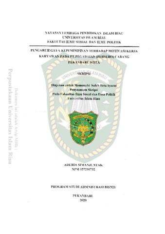 Simanjuntak, Aderia (2020) Pengaruh Gaya Kepemimpinan Terhadap Motivasi Kerja Karyawan Pada PT. Pegadaian (Persero) Cabang Pekanbaru Kota. Other thesis, Universitas Islam Riau.