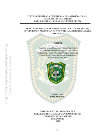 Putra, Adi (2020) Pencurian Dengan Pemberatan (CURAT) Oleh Remaja (Studi Kasus Pencurian Sawit Warga Lubuk Bendahara Tahun 2018). Other thesis, Universitas Islam Riau.