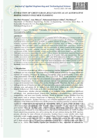Purnama, Dita Putri (2023) Extraction Of Green Grass Jelly Leaves As An Alternative Biopolymer In Polymer Flooding. EXTRACTION OF GREEN GRASS JELLY LEAVES AS AN ALTERNATIVE BIOPOLYMER IN POLYMER FLOODING.