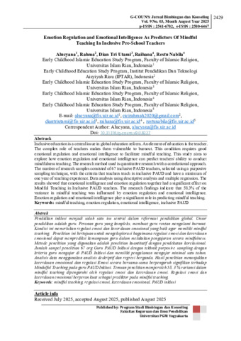 Alucyana, Alucyana and Rahma, Rahma and Utami, Dian Tri and Raihana, Raihana and Nabila, Restu (2025) Emotion Regulation and Emotional Intelligence as Predictors of Mindful Teaching In Inclusive Pre-School Teachers. G - Counts: Jurnal Bimbingan dan konseling, 3 (3). pp. 2429-2443. ISSN 2580-6467
