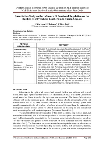 Alucyana, Alucyana and Raihana, Raihana and Zeni, Sisra (2024) Quantitative Study on the Influence Of Emotional Regulation on the Resilience of Preschool Teachers in Inclusion Schools. In: International Conference On Islamic Education And Islamic Business (ICoBEI).