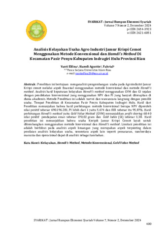 Elfina, Yanti and Agustin, Hamdi and Fahrial, Fahrial (2024) Analisis Kelayakan Usaha AgroIndustri Jamur Krispi Cemot Menggunakan Metode Konvensional dan Hamdi’s Method di Kecamatan Pasir Penyu Kabupaten Indragiri Hulu Provinsi Riau. Syarikat: Jurnal Ekonomi Rumpun Syariah, 7 (2). pp. 400-414. ISSN 2621-6051