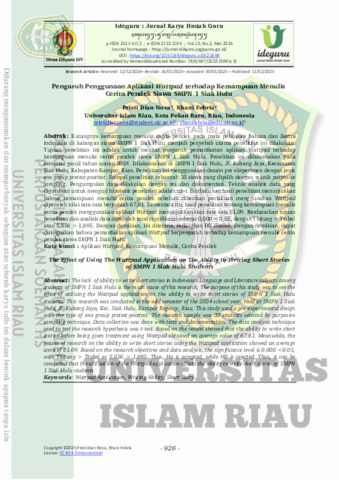 The Effect of Using The Wattpad Application on The Ability to Writing Short Stories of SMPN 1 Siak Hulu Students Abstract: The lack of ability to write short stories in Indonesian Language and Literature subjects among students of SMPN 1 Siak Hulu is the main cause of this research. The purpose of this study was to see the effect of utilizing the Wattpad application on the ability to write short stories of SMPN 1 Siak Hulu students. This research was conducted in the odd semester of the 2024 school year. Held at SMPN 1 Siak Hulu, Jl. Kubang Jaya, Kec. Siak Hulu, Kampar Regency, Riau. This study used a pre-experimental design with the type of one group pretest-posttest. The research sample was 33 students selected by purposive sampling technique. Data collection was done with tests and documentation. The data analysis technique used to test the research hypothesis was t-test. Based on the results showed that the ability to write short stories before being given treatment using Wattpad obtained an average value of 67.61. Meanwhile, the results of research on the ability to write short stories using the Wattpad application showed an average score of 81.09. Based on the research objectives and data analysis, the significance level is 0.000 <0.05, with Thitung > Ttabel or 5.856 > 1.695. Thus, Ha is accepted, while H0 is rejected. Thus, it can be concluded that the utilization of the Wattpad application affects the ability to write short stories of SMPN 1 Siak Hulu students.