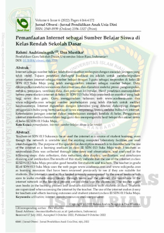 Teachers at SDN 013 Sukamaju have used the internet as a source of student learning, even though the network is unstable and the existing computer laboratory facilities are used interchangeably.The purpose of this qualitative descriptive research is to describe how the use of the internet as a learning medium in class III SDN 013 Suka Maju with 3 teachers as respondents.Data was collected through interviews and observations, and analyzed in the following steps: data collection, data reduction, data display, verification, and conclusion drawing and verification.The results of this study indicate that the use of the internet in class III SDN 013 Suka Maju provides good benefits for students and teachers. The teacher in grade III of SDN 013 Suka Maju uses the web pages www.academia.com and www.wikipedia.com as learning resources that have been reviewed previously to see if they are suitable for students. The internet is used with a limited intensity accompanied by the use of books which aims to make students enjoy literacy through books and the internet. The limitations of the internet network in the learning process are an obstacle in the classroom. The teacher again uses books in the learning process and conducts discussions with students in class. Students are supervised when accessing the internet by the teacher. The use of the internet makes it easy for teachers and affects learning outcomes and student interest in class III SDN 013 Suka Maju.