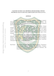 Penelitian ini bertujuan untuk menguji pengaruh keterlibatan pemakai, dukungan pimpinan, formalisasi pengembangan, program pelatihan dan pendidikan pemakai, dan keberadaan dewan pengarah sistem informasi akuntansi pada SKPD Kabupaten Pelalawan. Metode yang digunakan untuk pengumpulan data adalah dengan menggunakan metode kuesioner. Data diperoleh dari persepsi para pemakai sistem informasi akuntansi. Sampel dalam penelitian ini adalah sub bagian keuangan, sub bagian umum dan kepegawaian, dan sub bagian program di seluruh SKPD kabupaten Pelalawan. Metode analisis data menggunakan regresi linear berganda. Hasil penelitian ini yang menunjukkan bahwa keterlibatan pemakai, dukungan pimpinan, formalisasi pengembangan berpengaruh signifikan terhadap kinerja sistem informasi akuntansi. Sedangkan program pelatihan dan pendidikan pemakai, dan keberadaan dewan pengarah tidak berpengaruh secara signifikan terhadap kinerja sistem informasi akuntansi.