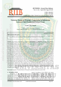 This research is motivated by 4 violations maxim principle of cooperation consisting maxim quantity, maxim of quality, maxim of relevance and maxim of implementation/manner that occurred in Indonesian Lawyers Clubs President debate event. The issue in this study is how principle of cooperation was violated in Indonesia Lawyers Club Presidential Debate Event. The purpose of this study is to describe violations maxim of cooperation and it is hoped that in the future, in speaking, values contained in 4 maxims can be applied and it employs a qualitative approach using the content analysis method. The data used in this study are all speeches made by host and resources persons during event, and researcher collected data using note-taking, listening, and documentation techniques. The researcher used content analysis as method of data analysis. The qualitative approach is related to content analysis method because both have aim of understanding content of research and emphasize the theoretical approach to research object, so that approach is relevant to this research because research combines opinions of several experts. the results showed that there were 54 data points on violation principle of cooperation in the Indonesia Lawyers Club Presidential Debate event. The researcher grouped violations into four Grice's maxims of principle of cooperation that had been violated, consisting of 26 data on maxim of quantity, 1 data on maxim of quality, 13 data on maxim of relevance, 14 data on maxim of implementation / manner and there are 2 data that violate in one data where two data have been entered into total number of data analysis. The violations that often occur are violations maxim of quantity, this occurs because participants in speech in the event convey information beyond what interlocutor wants. The violations that often occur are violations maxim of quantity. This occurs because the participants in event convey information that interlocutor does not want, such as when expressing their opinions they often exaggerate. The conclusion of this study, from the 4 maxims have an important role in event of speech, especially in object that the researcher took, but here researcher emphasizes that the application of these 4 maxims, cannot always be applied in cultural values of Indonesian society because they only apply in certain situations and conditions. This is because Indonesian society still upholds the values of friendliness and politeness.