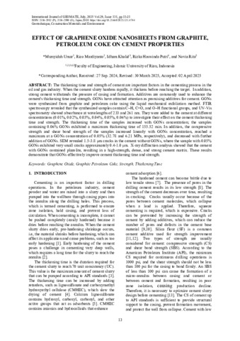 Umar, Mursyidah and Mardiyanto, Rico and Khalid, Idham and Haswinda Putri, Rizka and Rita, Novia (2025) EFFECT OF GRAPHENE OXIDE NANOSHEETS FROM GRAPHITE, PETROLEUM COKE ON CEMENT PROPERTIES. International Journal of GEOMATE, 29 (131). pp. 13-21. ISSN 2186-2982