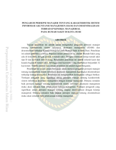 Pengaruh Persepsi Manajer Tentang Karakteristik Sistem Informasi Akuntansi Manajemen (Siam) Dan Desentralisasi Terhadap Kinerja Manajerial Pada Rumah Sakit Di Kota Duri