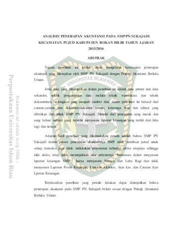 Tujuan penelitian ini adalah untuk mengetahui kesesuaian penerapan akuntansi yang diterapkan oleh SMP PN Sukajadi dengan Prinsip Akuntansi Berlaku Umum. Jenis data yang dikumpulkan dalam penelitian ini adalah data primer dan data sekunder, teknik pengumpulan data melalui teknik wawancara dan teknik dokumentasi, sedangkan yang menjadi sumber data dalam penelitian ini berasal dari catatan-catatan dan dokumen-dokumen tertulis, keteranga lisan dan tulisan yang diberikan dari pihak SMP PN Sukajadi. Dimulai dari pencatatan uang masuk dan uang keluar sampai yang terakhir menyususn laporan keuangan yang terdiri dari laba rugi dan neraca. Adapun hasil penelitian yang dikemukakan penulis adalah bahwa SMP PN Sukajadi dalam proses pencatatan akuntansinya SMP tidak membuat jurnal untuk setiap transaksi juga tidak melakukan penyusutan terhadap aktiva tetapnya sehingga nilai aktiva tetap tidak menunjukkan nilai sebenernya. Sementara dalam menyususn laporan keuangan SMP hanya menyususn Neraca dan Laba Rugi dan tidak menyususn Laporan Posisi Keuangan, Laporan Aktivitas, Arus kas, dan Catatan Atas Lporan Keuangan. Berdasarkan penelitian yang penulis lakukan dapat disimpulkan bahwapenerapan akuntansi pada SMP PN Sukajadi belum sesuai dengan Prinsip Akuntansi Berlaku Umum.