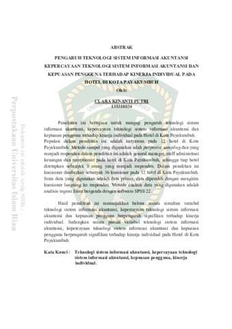 Putri, Clara Kinanti (2018) Pengaruh Teknologi Sistem Informasi Akuntansi Kepercayaan Teknologi Sistem Informasi Akuntansi Dan Kepuasan Pengguna Terhadap Kinerja Individual Pada Hotel Di Kota Payakumbuh. Other thesis, Universitas Islam Riau.
