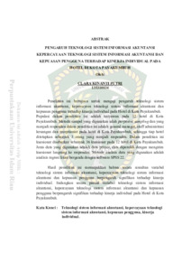 Penelitian ini bertujuan untuk menguji pengaruh teknologi sistem informasi akuntansi, kepercayaan teknologi sistem informasi akuntansi dan kepuasan pengguna terhadap kinerja individual pada Hotel di Kota Payakumbuh. Populasi dalam penelitian ini adalah karyawan pada 12 hotel di Kota Payakumbuh. Metode sampel yang digunakan ialah purposive sampling dan yang menjadi responden dalam penelitian ini adalah general manager, staff administrasi keuangan dan receptionist pada hotel di Kota Payakumbuh, sehingga tiap hotel ditetapkan sebanyak 3 orang yang menjadi responden. Dalam penelitian ini kuesioner disebarkan sebanyak 36 kuesioner pada 12 hotel di Kota Payakumbuh. Jenis data yang digunakan adalah data primer, data diperoleh dengan mengirim kuesioner langsung ke responden. Metode analisis data yang digunakan adalah analisis regresi linier berganda dengan software SPSS 22. Hasil penelitian ini menunjukkan bahwa secara simultan variabel teknologi sistem informasi akuntansi, kepercayaan teknologi sistem informasi akuntansi dan kepuasan pengguna berpengaruh signifikan terhadap kinerja individual. Sedangkan secara parsial variabel teknologi sistem informasi akuntansi, kepercayaan teknologi sistem informasi akuntansi dan kepuasan pengguna berpengaruh signifikan terhadap kinerja individual pada Hotel di Kota Payakumbuh.