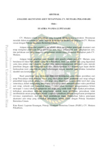 CV. Mutiara adalah perusahaan yang bergerak dibidang jasa kontraktor. Perumusan masalah dalam penelitian ini yaitu: Apakah penerapan akuntansi aset tetap pada CV. Mutiara sesuai dengan Prinsip Akuntansi Berterima Umum. Adapun tujuan dari penelitian ini adalah untuk mengetahui penerapan akuntansi aset tetap mengenai penentuan harga perolehan aset, biaya penyusutan aset, penghapusan aset, dan perlakuan aset tetap mengenai pengeluaran setelah masa perolehan diterapkan pada CV. Mutiara. Adapun lokasi penelitan yang diambil oleh penulis adalah pada CV. Mutiara yang beralamat di Jalan Parit Indah Ujung No 6 Pekanbaru. Jenis dan sumber data yang digunakan yaitu data primer dan sekunder. Analisis data menggunakanmetode deskriptif yaitu metode penelitian dengan cara mengumpulkan data, dikelompokkan lalu disusun agar dapat diteliti berdasarkan teori yang relevan yang berhubungan dengan masalah yang dibahas kemudian diambil satu kesimpulan. Hasil penelitian yang dilakukan diperoleh kesimpulan yaitu dalam perolehan aset tetap Perusahaan tidak mencatat biaya yang dikelyarkan dalam pembelian aset tetap sebagai penambah harga pokok pembelian aset tetap yang dilaporkan menjadi lebih kecil dari yang semestinya, dalam menghitung penyusutan perusahaan tidak memperhatikan waktu perolehan aset tetap, seluruh aset disusutkan dalam 1 (satu) tahun meskipun penggunaannya belum mencapai 1 (satu) tahun, penghapusan aset tetap yang sudah tidak dapat dipakai perusahaan, kebijakan perusahaan terhadap pengeluaran setelah masa perolehan, perusahaan tidak membedakan antara pengeliaran modal (capital expenditure) dengan pengeluaran pendapatan (revenue expenditure), dan dari hasil pembahasan dapat disimpulkan bahwa penerapan akuntansi aset tetap yang dilakukan perusahaan, belum sesuai dengan Prinsip Akuntansi Berterima Umum.