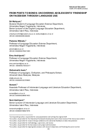 Wahyuni, Sri and Widodo, Pratomo and Andriyanti, Erna and Isam, Hishamudin and Asnawi, Asnawi and Andriyani, Noni (2025) From posts to bonds: Uncovering adolescents’ friendship on Facebook through language use. Advanced Education, 13 (26). pp. 45-58. ISSN 2410-8286