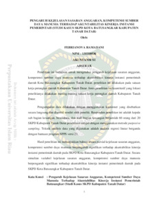 Penelitian ini bertujuan untuk mengetahui pengaruh kejelasan sasaran anggaran, kompetensi sumber daya manusia terhadap akuntabilitas kinerja instansi pemerintah daerah Kota Batusangkar Kabupaten Tanah Datar. penelitian ini dilakukan pada satuan kerja perangkat daerah Kabupaten Tanah Datar. Jenis penelitian ini kuantitatif yang lokasi penelitianya dilakukan masing-masing satuan kerja perangkat daerah Kabupaten Tanah Datar. Pengumpulan data dilakukan dengan menggunakan kuesioner yang disebarkan secara langsung dan diambil sendiri oleh peneliti. Responden penelitian ini adalah kepala sub bagian keuangan, bendahara, dan staff bagian keuangan berjumlah 60 orang dari 20 SKPD Kabupaten Tanah Datar.penentuan sampel dengan menggunakan metode purposive sampling. Teknik analisis data yang digunakan adalah analisis regresi linear berganda dengan bantuan program SPPS versi 23. Hasil penelitian ini menunjukkan bahwa secara parsial kejelasan sasaran anggaran, kompetensi sumber daya manusia berpengaruh signifikan terhadap akuntabilitas kinerja instansi pemerintah daerah pada SKPD Kota Batusangkar Kabupaten Tanah Datar. Secara simultan variabel kejelasan sasaran anggaran, kompetensi sumber daya manusia berpengaruh signifikan terhadap akuntabilitas kinerja instansi pemerintah daerah pada SKPD Kota Batusangkar Kabupaten Tanah Datar.
