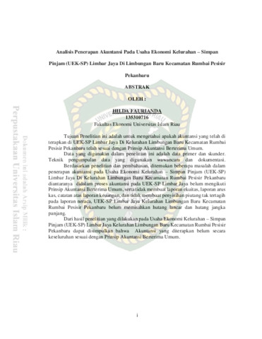 Faurianda, Hilda (2018) Analisis Penerapan Akuntansi Pada Usaha Ekonomi Kelurahan – Simpan Pinjam (UEK-SP) Limbar Jaya Di Limbungan Baru Kecamatan Rumbai Pesisir Pekanbaru. Other thesis, Universitas Islam Riau.