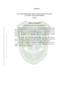 Tujuan penelitian ini adalah untuk mengetahui kesesuain penerapan akuntansi aset tetap pada PT. Tirta Emas Kemasindo. Data yang terkumpul merupakan data primer dan data sekunder, teknik pengumpulan data dalam penelitian ini adalah wawancara dan dokumentasi. Setelah semua data terkumpul kemudian data dianalisis dengan menggunakan metode deskriptif. Berdasarkan hasil penelitian dan pembahasan dapat disimpulkan bahwa perlakuan akuntansi aset tetap pada PT. Tirta Emas Kemasindo belum sesuai dengan prinsip-prinsip akuntansi yang berlaku umum.