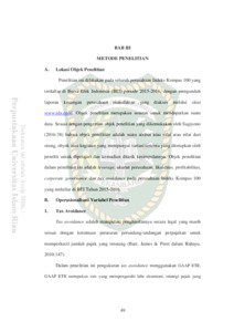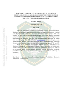 This study aims to examine the effect of leverage, firm size, liquidity, profitability, and independent commissioner to tax avoidance. The population used in this study is a compass 100 index company listed on the BEI or Indonesia Stock Exchange 2015-2016. The sample is determined by purposive sampling method and obtained sample of 60 companies with a total of 120 observations. The type of data used in this study is secondary data obtained from the website www.idx.co.id and company website respectively. Data analysis was done by multiple regression analysis. Hypothesis testing used is t test and F test using SPSS program version 23.Result of t test of research indicate that leverage, profitability and liquidity influence to tax avoidance. However, this study can not prove that firm size,independent commissioner affect tax avoidance, but simultaneously leverage, firm size, liquidity, profitability, and corporate governance have a significant effect on tax avoidance.