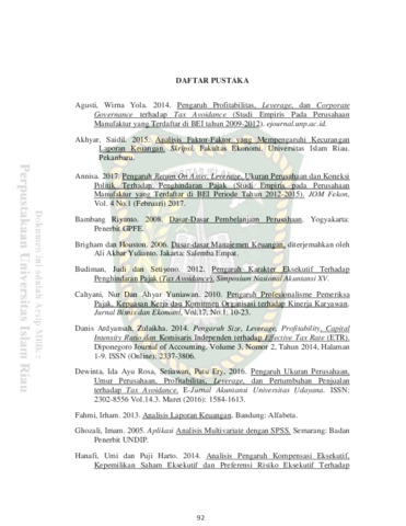 Siahaan, Iin Elizer (2018) Pengaruh Leverage, Ukuran Perusahaan, Likuiditas, Profitabilitas, Dan Komisaris Independen Terhadap Tax Avoidance (Studi Empiris Pada Perusahaan Indeks Kompas 100 Yang Terdaftar Di Bei 2015-2016). Other thesis, Universitas Islam Riau.