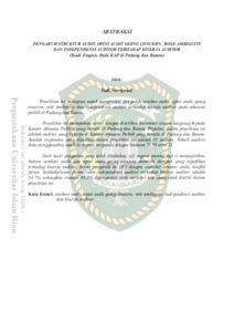 Penelitian ini bertujuan untuk mengetahui pengaruh struktur audit, opini audit going concern, role ambiguity dan independensi auditor terhadap kinerja auditor pada akuntan publik di Padang dan Batam. Penelitian ini merupakan survei dengan distribusi kuesioner secara langsung kepada Kantor Akuntan Publlik yang berada di Padang dan Batam. Populasi dalam penelitian ini adalah auditor yang bekerja di Kantor Akuntan Publik yang berada di Padang dan Batam. Jumlah responden yang dijadikan dalam penelitian ini adalah 88 auditor. Teknik analisis data menggunakan analisis regresi berganda dengan bantuan SPSS versi 21. Dari hasil pengujian yang telah dilakukan, uji regresi parsial (uji t) menunjukkan bahwa struktur audit dan opini audit going concern memiliki dampak yang signifikan terhadap kinerja auditor. Besar pengaruh itu (R2)dengan variabel struktur audit, konflik peran, ketidakjelasan peran dan independensi auditor terhadap kinerja auditor adalah 54,7% sedangkan sisanya 45,3% dipengaruhi oleh variabel lain yang tidak diteliti dalam penelitian ini.