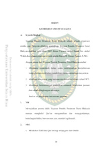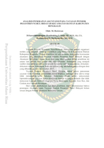 YayasanPondokPesantrenNurulHidayahmerupakan sebuah organisasi nirlaba yang bergerakdibidangpendidikan yang beralamat di KecamatanBantan KabupatenBengkalis. Tujuanpenelitian iniadalahuntukmengetahuikesesuaian akuntansi yang diterapkan YayasanPondokPesantrenNurul Hidayah dengan Akuntansi BerterimaUmum. Jenis data yang dikumpulkandalampenelitian ini antara lain adalah data primer dan data sekunder. Sedangkan yang menjadi sumber data dalampenelitianiniadalahbersumberdaricatatan-catatan, dokumendokumentertulis, keteranganlisandantulisan yang adahubungannyadengan data yang dibutuhkanyaituuntuktahun 2017.Yayasan Pondok Pesantren Nurul Hidayah dalam proses pencatatan yayasan tidakmembuat penyusutanaktiva tetapnya, sehingga nilai aktiva tetap tidak menunjukan nilai bukunya. Sementara dalam proses penyusunan laporankeuangan, yayasanhanyamenyusun laporankeuanganbulanandan tidak menyusunLaporanAktivitas, LaporanPosisi Keuangan, LaporanArusKas, dan CatatanatasLaporanKeuangan. Dari uraianpembahasandanhasil penelitian, dapat dikemukakanbahwa penerapan Akuntansi pada Yayasan Pondok Pesantren Nurul Hidayah belum sesuaidenganPrinsipAkuntansiBerterimaUmum.