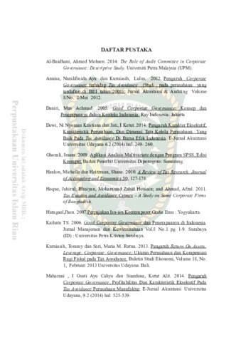 Seftiany, Morisa (2018) Pengaruh Profitabilitas, Corporate Governance Dan Kompensasi Rugi Fiskal Terhadap Tax Avoidance Pada Perusahaan Jasa Dan Transportasi Yang Terdaftar Di Bursa Efek Indonesia Tahun 2014-2016. Other thesis, Universitas Islam Riau.