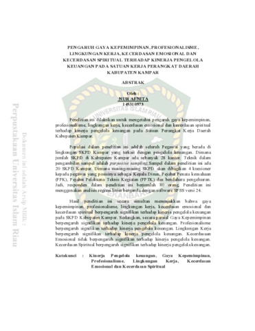 Afnita, Nur (2018) Pengaruh Gaya Kepemimpinan, Profesionalisme, Lingkungan Kerja, Kecerdasan Emosional Dan Kecerdasan Spiritual Terhadap Kinerja Pengelola Keuangan Pada Satuan Kerja Perangkat Daerah Kabupaten Kampar. Other thesis, Universitas Islam Riau.