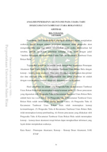 Perusahaan kecil membutuhkan penerapan akuntansi dalam menjalankan usahanya karena dengan adanya penerapan akuntansi maka pengusaha akan mengetahui laba atau rugi dalam menjalankan suatu usaha. Berdasarkan hal tersebut, penulis melakukan penelitian terhadap usaha kecil dengan judul “Analisis Penerapan Akuntansi Pada Usaha Tahu Di Kecamatan Tambusai Utara Rokan Hulu.” Tujuan dari penelitian ini adalah untuk mengetahui kesesuaian Penerapan Akuntansi Pada Usaha Tahu Di Kecamatan Tambusai Utara Rokan Hulu dengan konsep – konsep dasar akuntansi. Data yang dikumpulkan merupakan data primer dan data sekunder serta teknik pengumpulan data dalam penelitian ini adalah dengan wawancara terstruktur, observasi, dokumentasi dan kuisioner. Hasil penelitian ini adalah : (1) PengusahaTahu di Kecamatan Tambusai Utara Rokan Hulu telah menerapkan konsep kesatuan usaha. (2) Dasar pencatatan yang digunakan oleh Pengusaha Tahu di Kecamatan Tambusai Utara Rokan Hulu adalah basis kas (cash basic). (3) Pengusaha tahu di Kecamatan Tambusai Utara Rokan Hulu sudah menerapkan konsep periode waktu. (4) Pengusaha Tahu di Kecamatan Tambusai Utara Rokan Hulu telah menerapkan konsep kesinambungan. (5) Pengusaha Tahu di Kecamatan Tambusai Utara Rokan Hulu telah menerapkan konsep pembanding. (6) Sistem pencatatan yang dilakukan oleh Pengusaha Tahu di Kecamatan Tambusai Utara Rokan Hulu sudah menerapkan konsep – konsep dasar akuntansi tetapi belum dapat menghasilkan informasi yang layak dalam menjalankan usahanya.