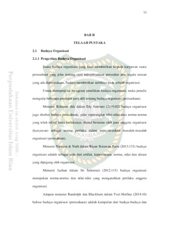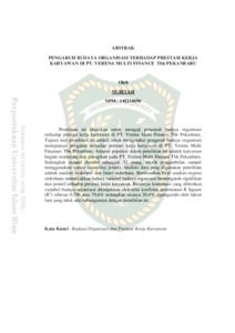 Pengaruh Budaya Organisasi Terhadap Prestasi Kkerja Karyawan Di PT. Verana Multi Finance Tbk Pekanbaru Oleh NURIYAH NPM : 145210696 Penelitian ini ditujukan untuk menguji pengaruh budaya organisasi terhadap prestasi kerja karyawan di PT. Verena Multi Finance Tbk Pekanbaru. Tujuan dari penelitian ini adalah untuk mengetahui pengaruh budaya organisasi mempunyai pengaruh terhadap prestasi kerja karyawan di PT. Verena Multi Finanace Tbk Pekanbaru. Adapun populasi dalam penelitian ini adalah karyawan bagian marketing dan penagihan pada PT. Verena Multi Finance Tbk Pekanbaru. Sedangkan sampel diambil sebanyak 33 orang, teknik pengambilan sampel menggunakan sensus (sampling jenuh). Analisis data yang digunakan penelitian adalah analisis deskriptif dan linier sederhana. Berdasarkan hasil analisis regresi sederhana menunjukkan bahwa variabel budaya organisasi berpengaruh signifikan dan positif terhadap prestasi kerja karyawan. Besarnya kontribusi yang diberikan variabel budaya organisasi ditunjukkan oleh nilai koefisien determinasi R Square (R 2 ) sebesar 0,796 atau 79,6% sedangkan sisanya 20,4% dipengaruhi oleh faktor lain yang tidak ada hubungannya dengan penelitian ini.