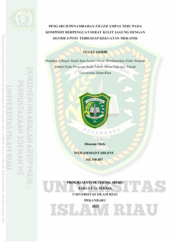 Fahlevi, Muhammad (2023) Pengaruh Penambahan Filler Ampas Tebu pada Komposit Berpenguat Serat Kulit Jagung dengan Matrik Epoxy terhadap Kekuatan Mekanik. Other thesis, Universitas Islam Riau.