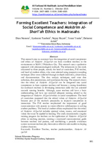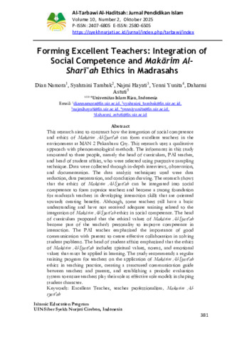Namora, Dian and Tambak, Syahraini and Hayati, Najmi and Yunita, Yenni and Astuti, Daharmi (2025) Forming Excellent Teachers Integration of Social Competence and Makārim AlSharī'ah Ethics in Madrasahs. Al-Tarbawi Al-Haditsah: Jurnal Pendidikan Islam, 10 (2). pp. 381-404. ISSN P-ISSN: 2407-6805